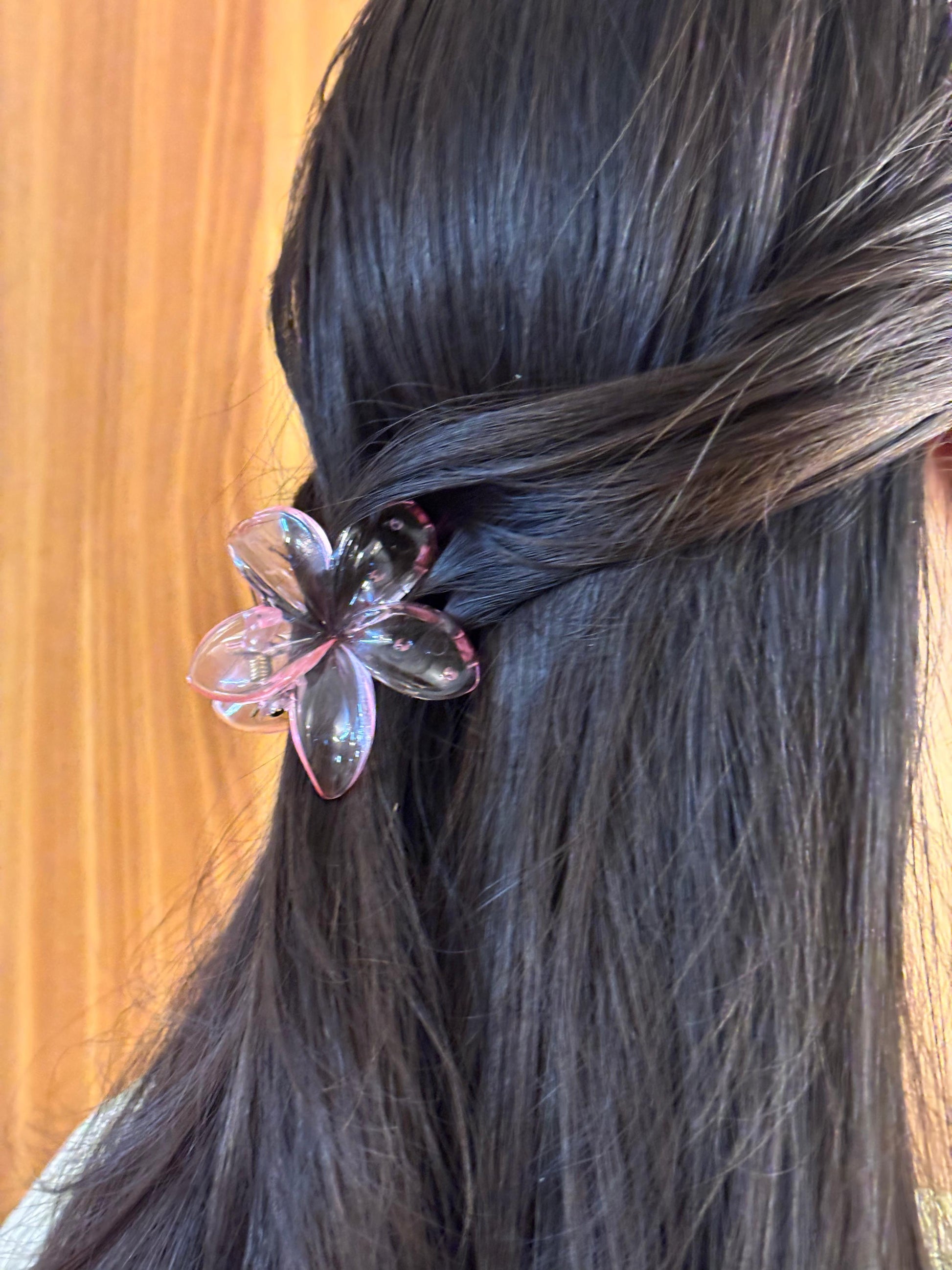 - Pink translucent flower hair clip β Large floral-shaped claw clip.