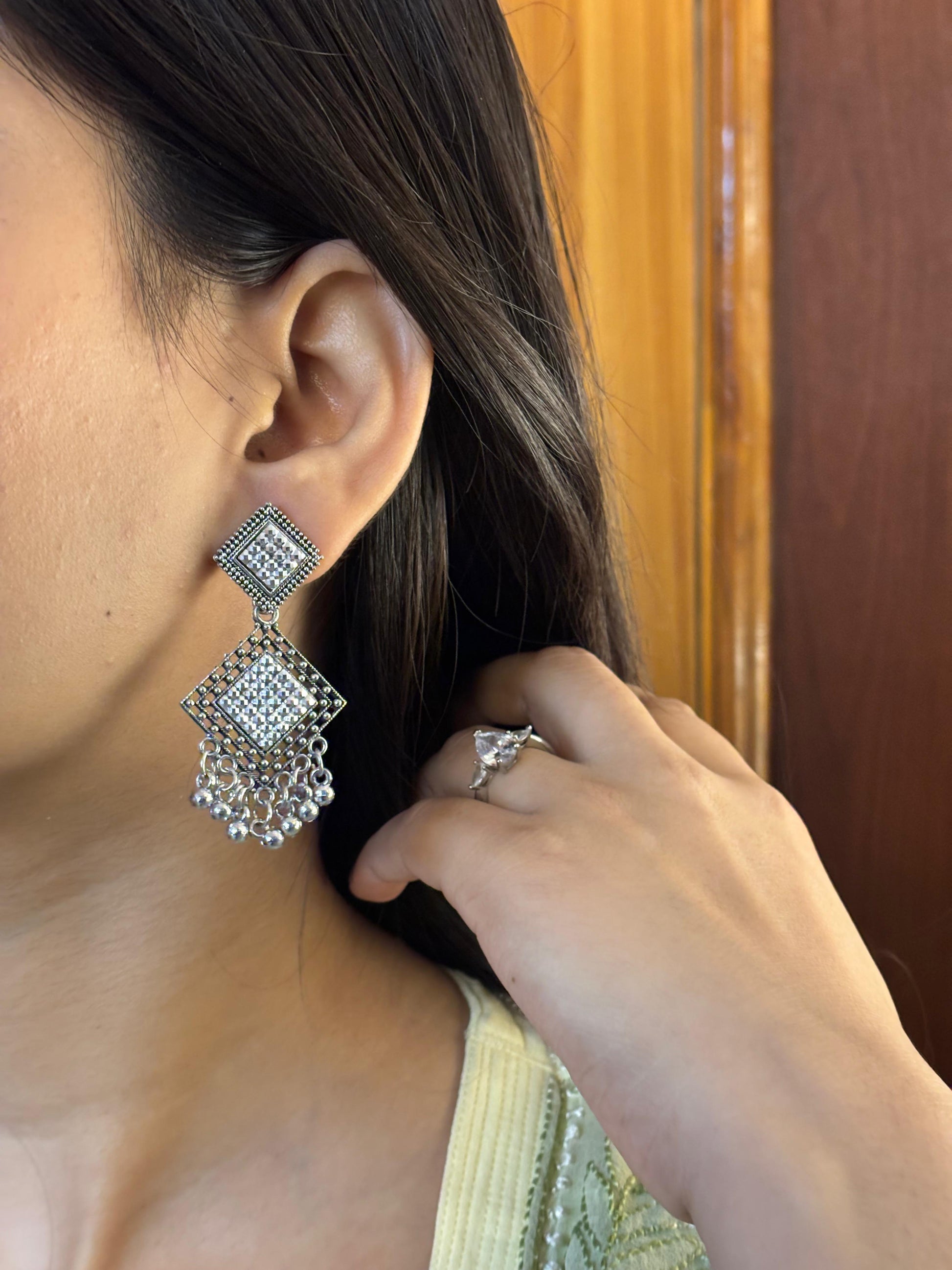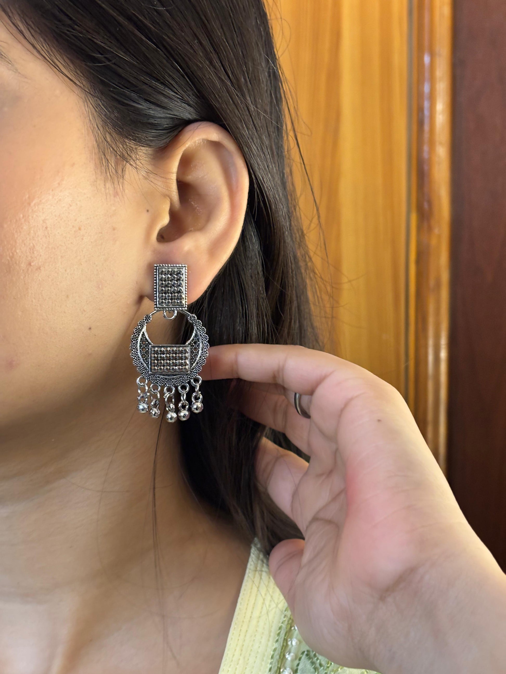 - Oxidised square jhumka earrings β Square engraved stud with layered dangling beads.