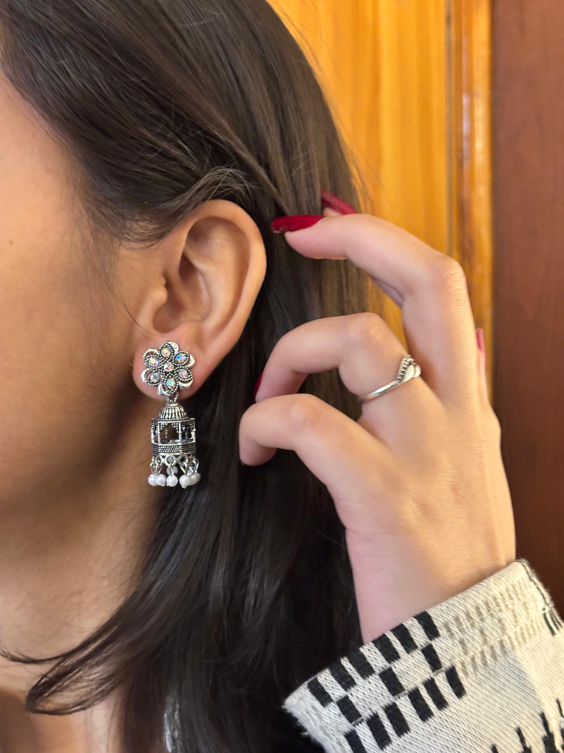 - Oxidised floral jhumka earrings β Flower-shaped stone stud with dome jhumka detailing.