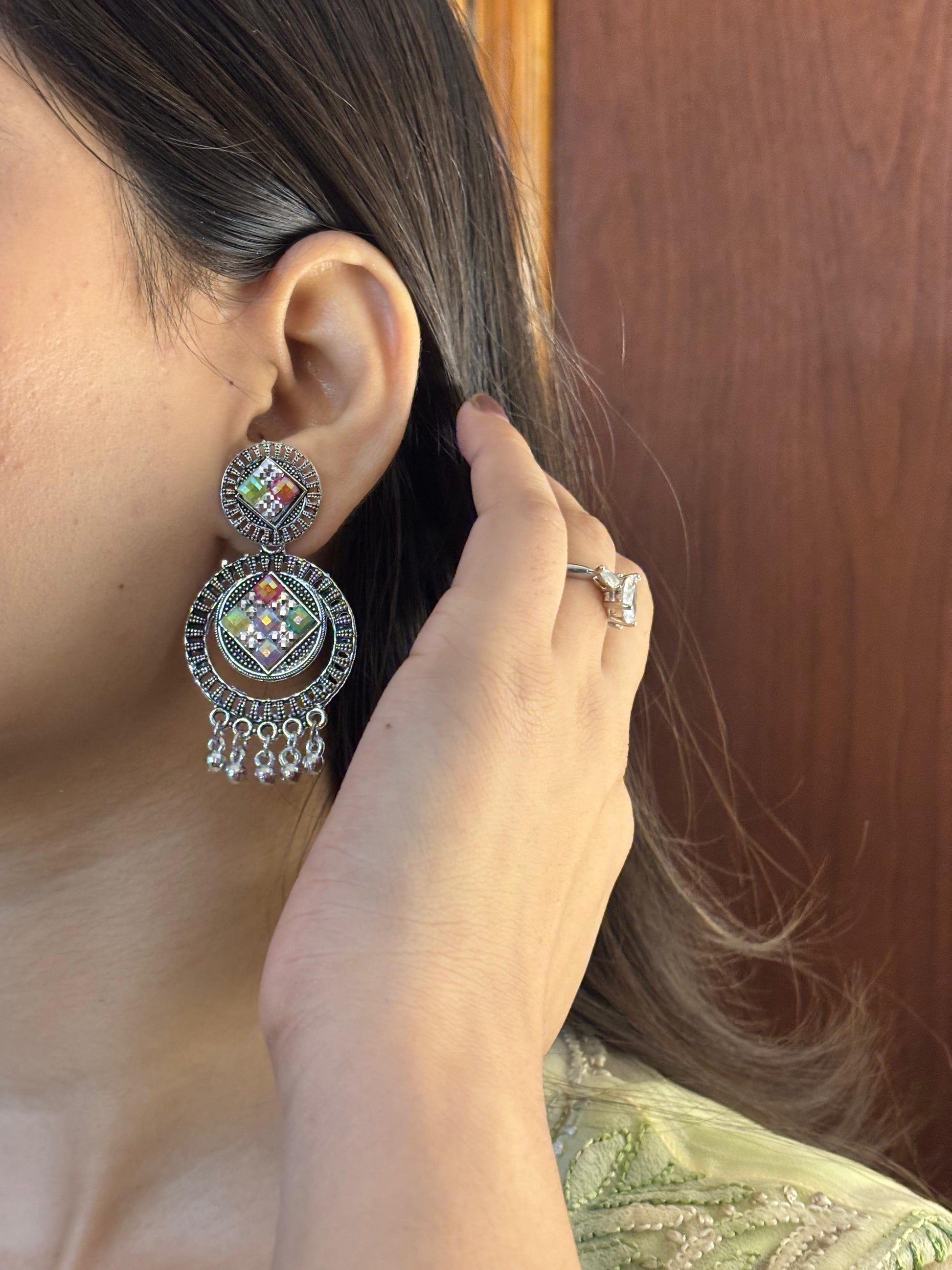 - Multicolour oxidised jhumka earrings β Circular stud with colourful stones and jhumka drops.